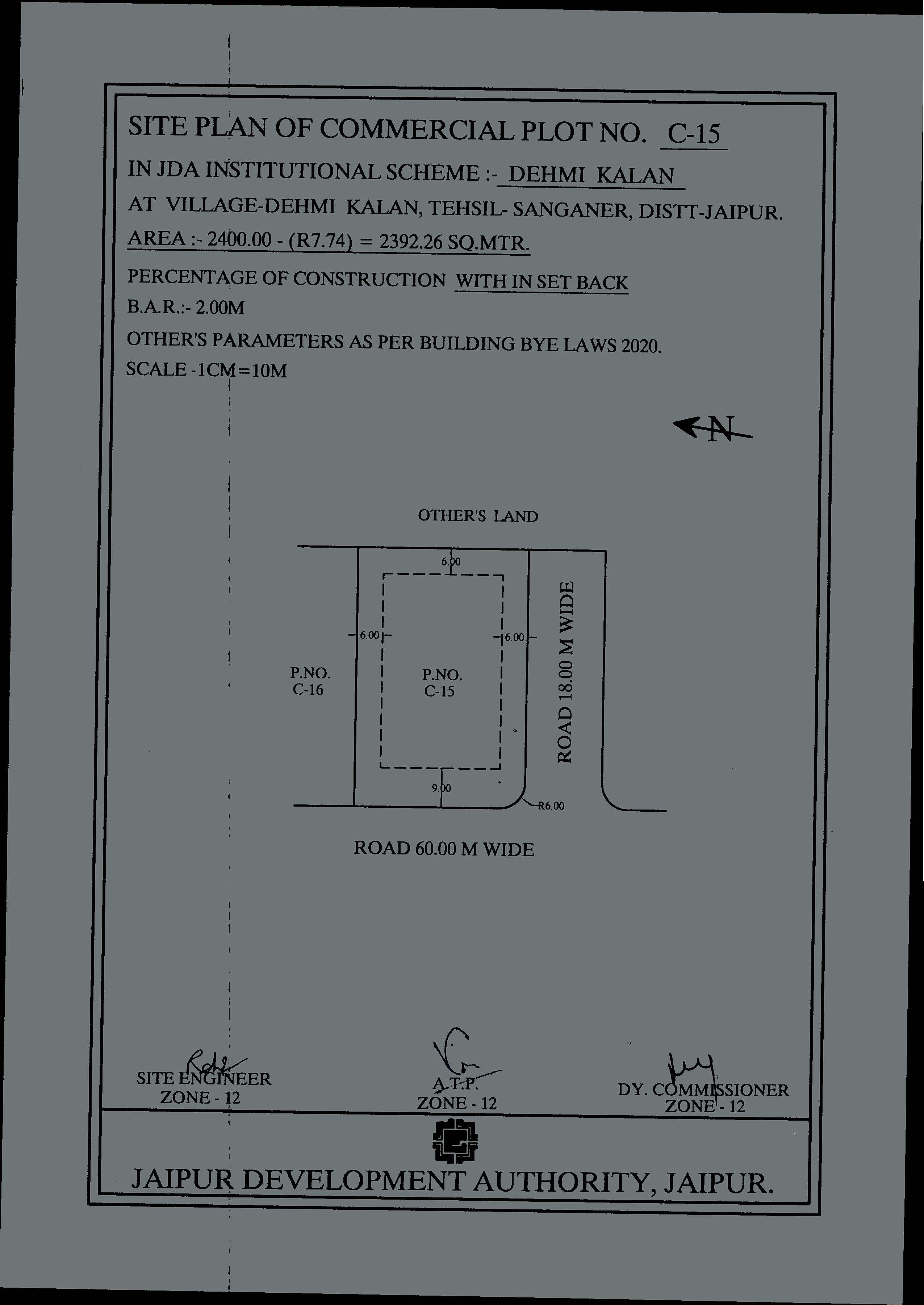 | Remarks | : | Commercial Plot No. C-15(Corner) Insititutional Scheme Village-Dehmikalla, Jaipur | |||||||