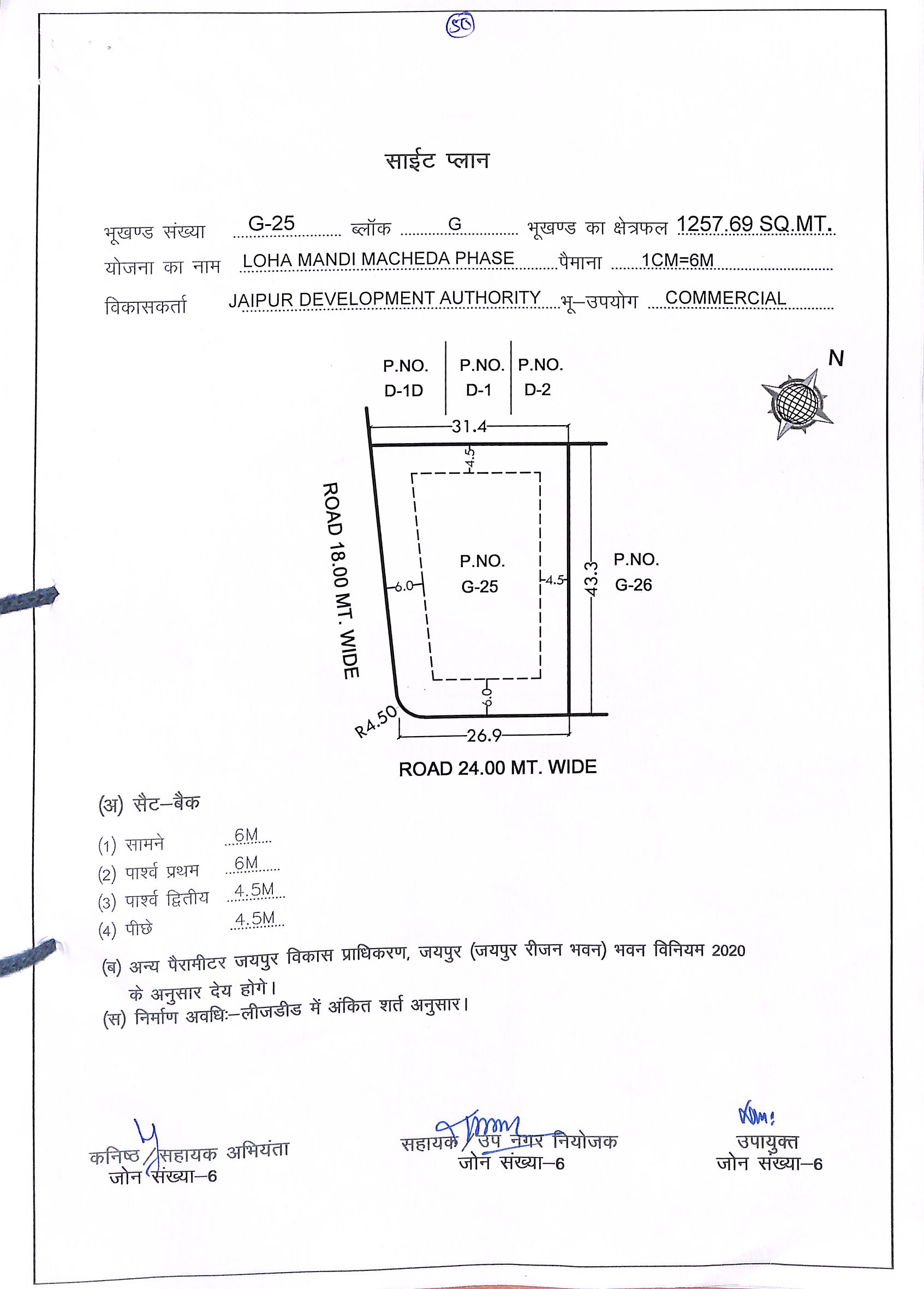 | Remarks | : | Commercial Plot No. G-25 (Corner) Loha Mandi Macheda Phase-I, Jaipur | |||||||