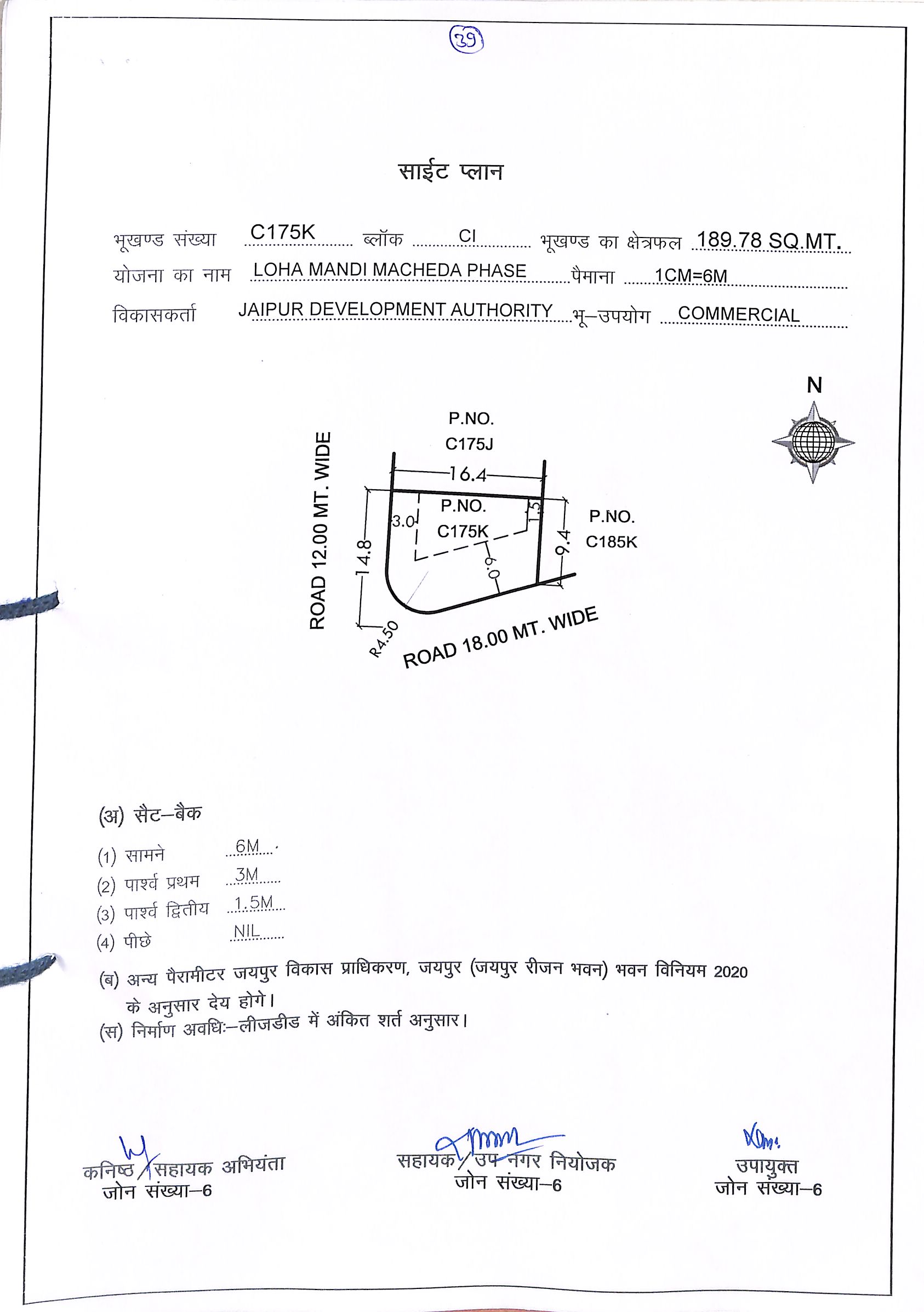| Remarks | : | Commercial Plot No. C-175 K (Corner) Loha Mandi Macheda Phase-I, Jaipur | |||||||