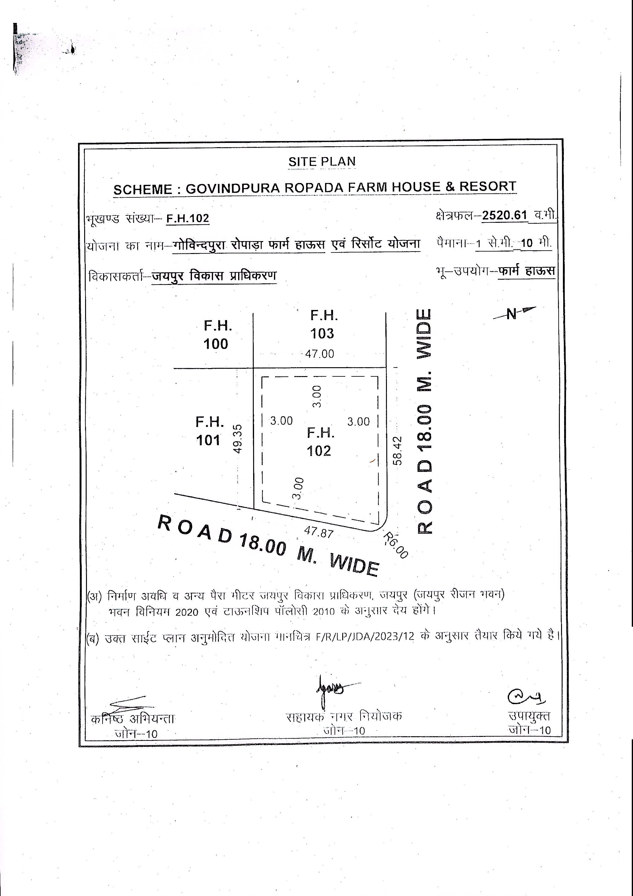 | Remarks | : | Farm House Plot No. FH-102 (Corner) Govindpura Ropada Scheme, Jaipur | |||||||