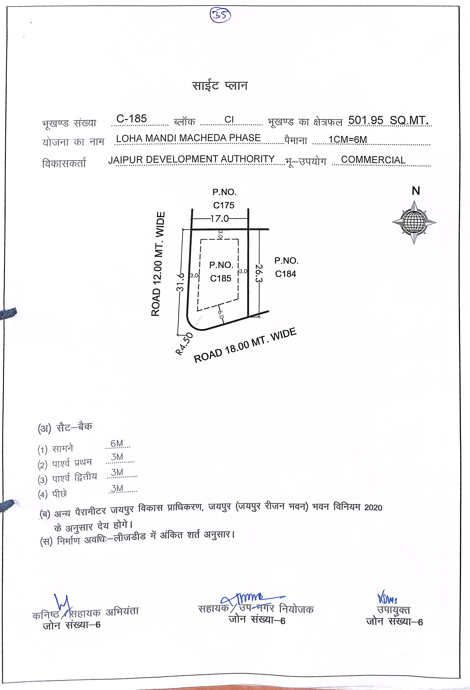 | Remarks | : | Commercial Plot No. C-185 (Corner) Loha Mandi Macheda Phase-I, Jaipur | |||||||