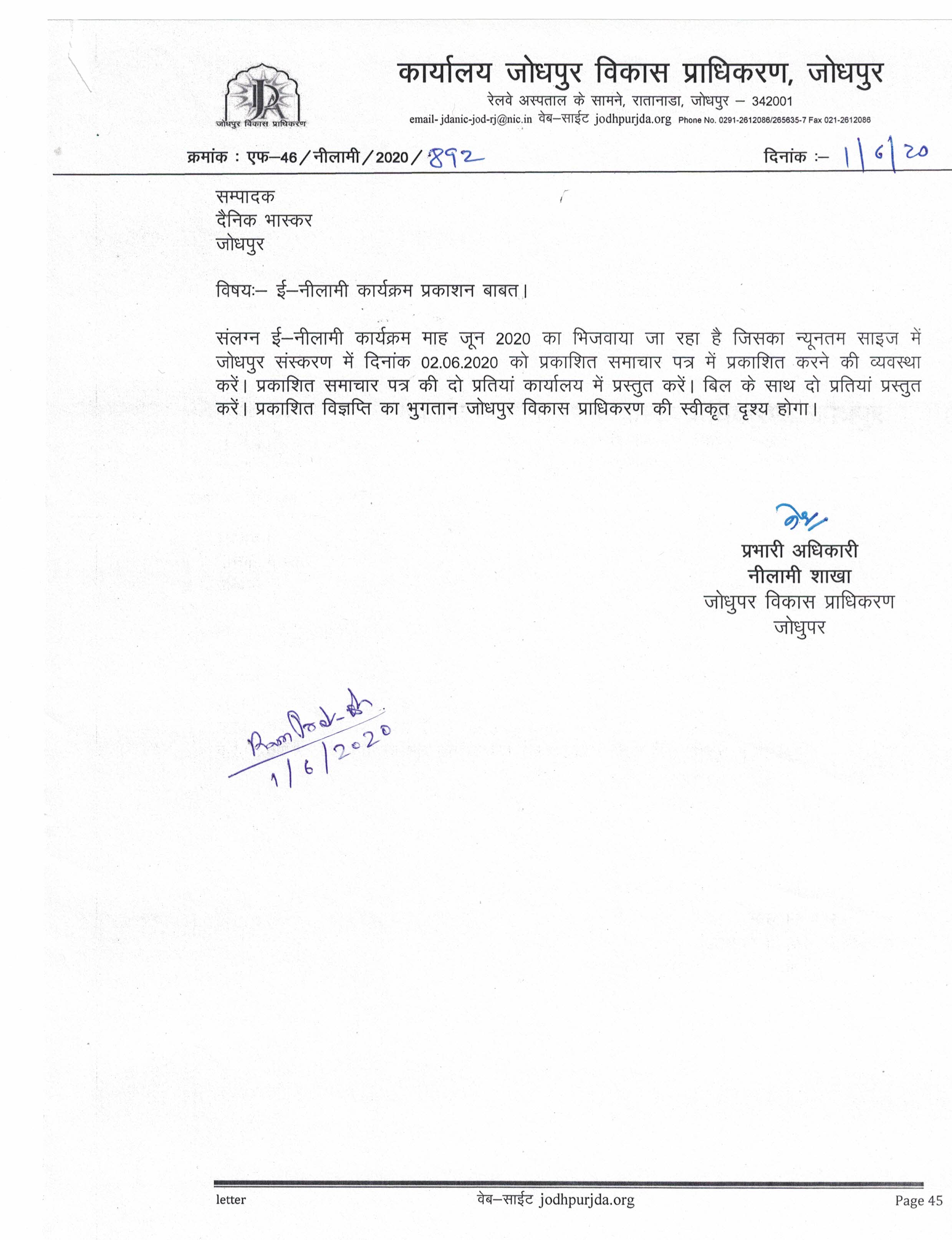 | ID/Title | : | [2090] / E-AUCTION RESIDENTIAL PLOT NO. N-643 VIVEK VIHAR YOJANA JODHPUR | |||